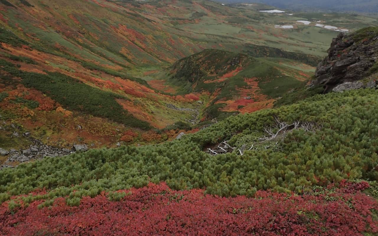 秋天山嶺的紅葉、冬天飄落的粉雪。