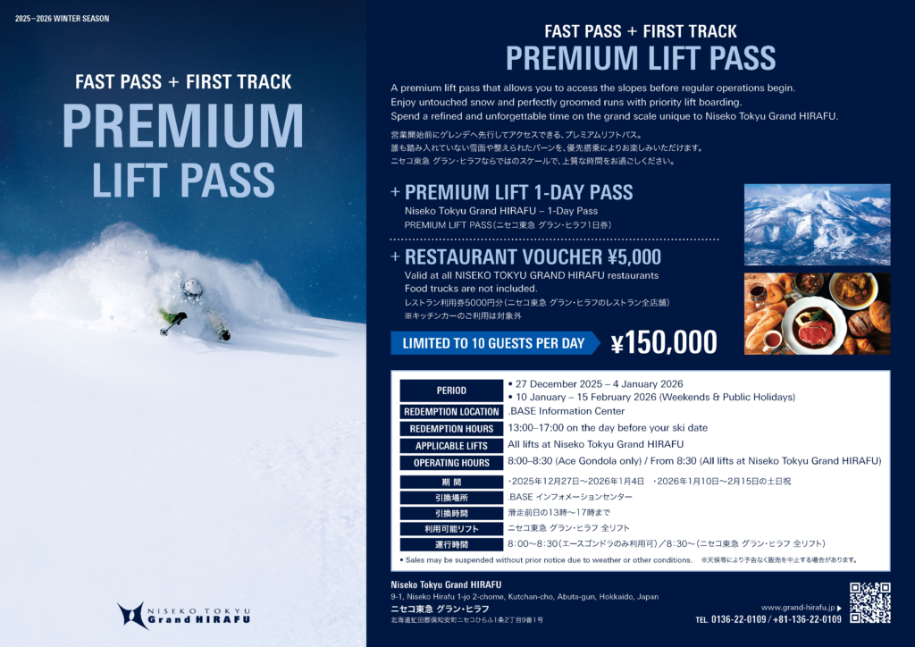 ・プレミアムリフトパスは、通常のリフト券とは異なる、ニセコ東急 グラン・ヒラフスキー場専用の特別チケットです。ニセコ東急 グラン・ヒラフのみをご利用の場合は、通常のリフト券は不要で、本チケット1枚で終日ご利用いただけます。